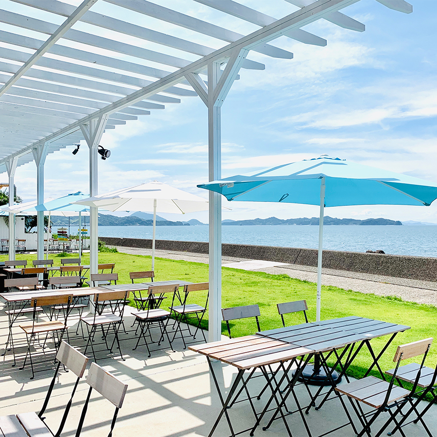 裏手には芝生とカフェのテラス席があり、多島美広がる瀬戸内海を間近に望めます。