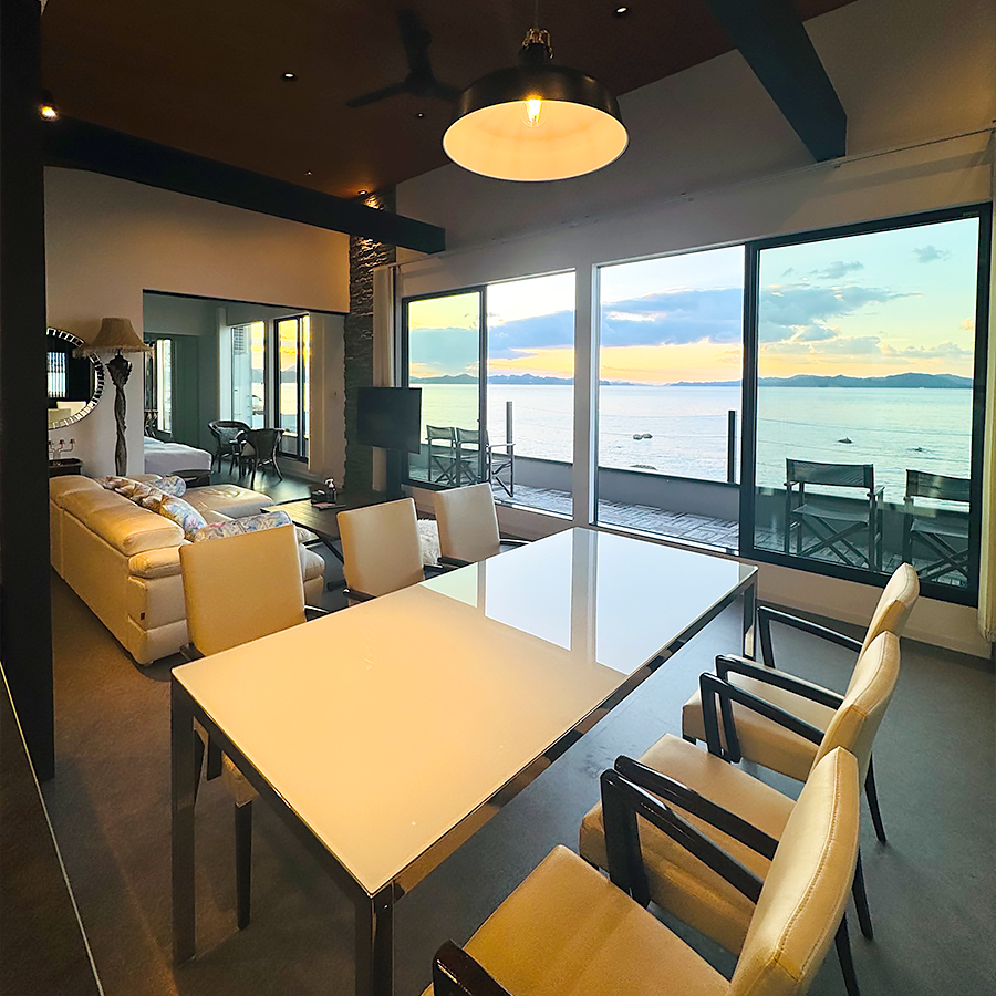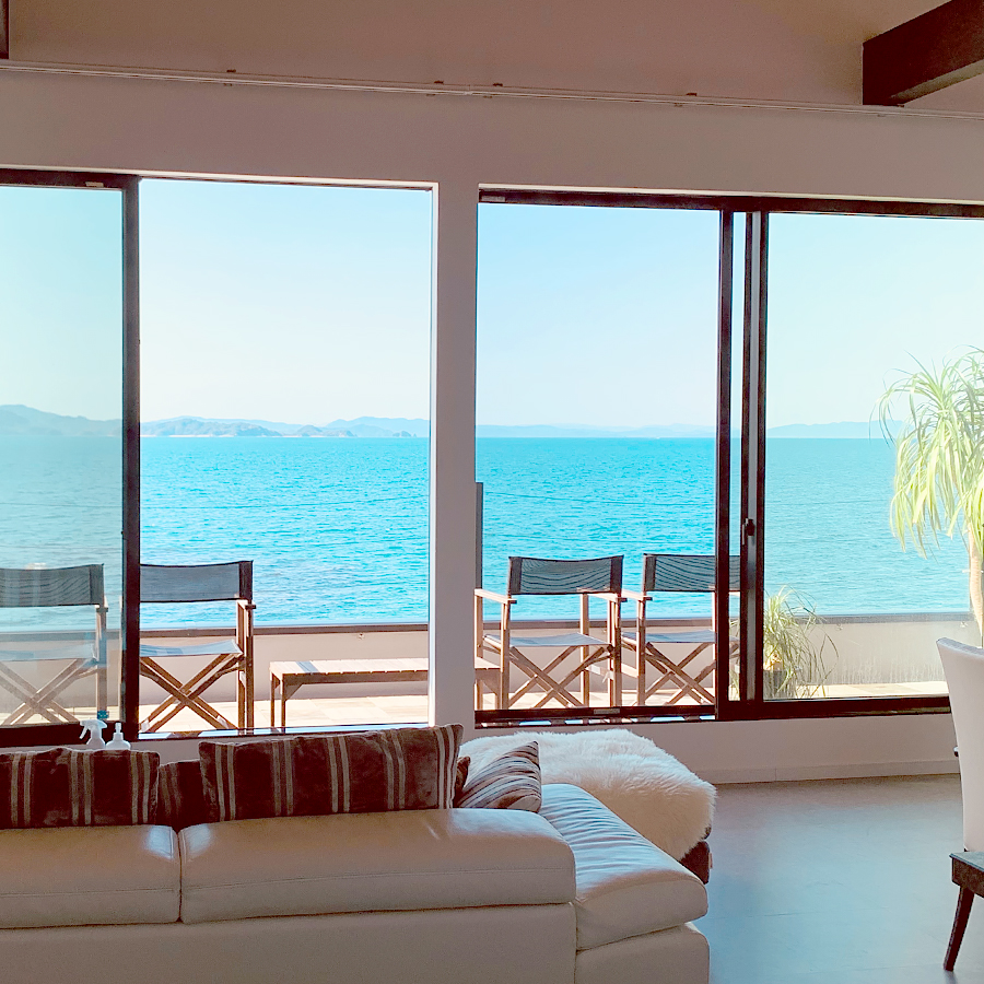 波音がBGM代わりになり、目覚めた時にはガラス窓いっぱいに広がる海や空の青と島々の緑が目に飛び込んできます。