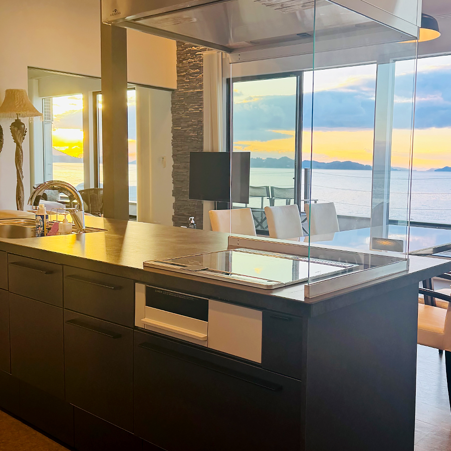 広々としたセラミック製の大型アイランドキッチンを囲み、電子レンジ・炊飯器などのキッチン家電・調理器具・食器類も一通り揃っています。