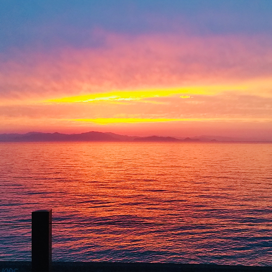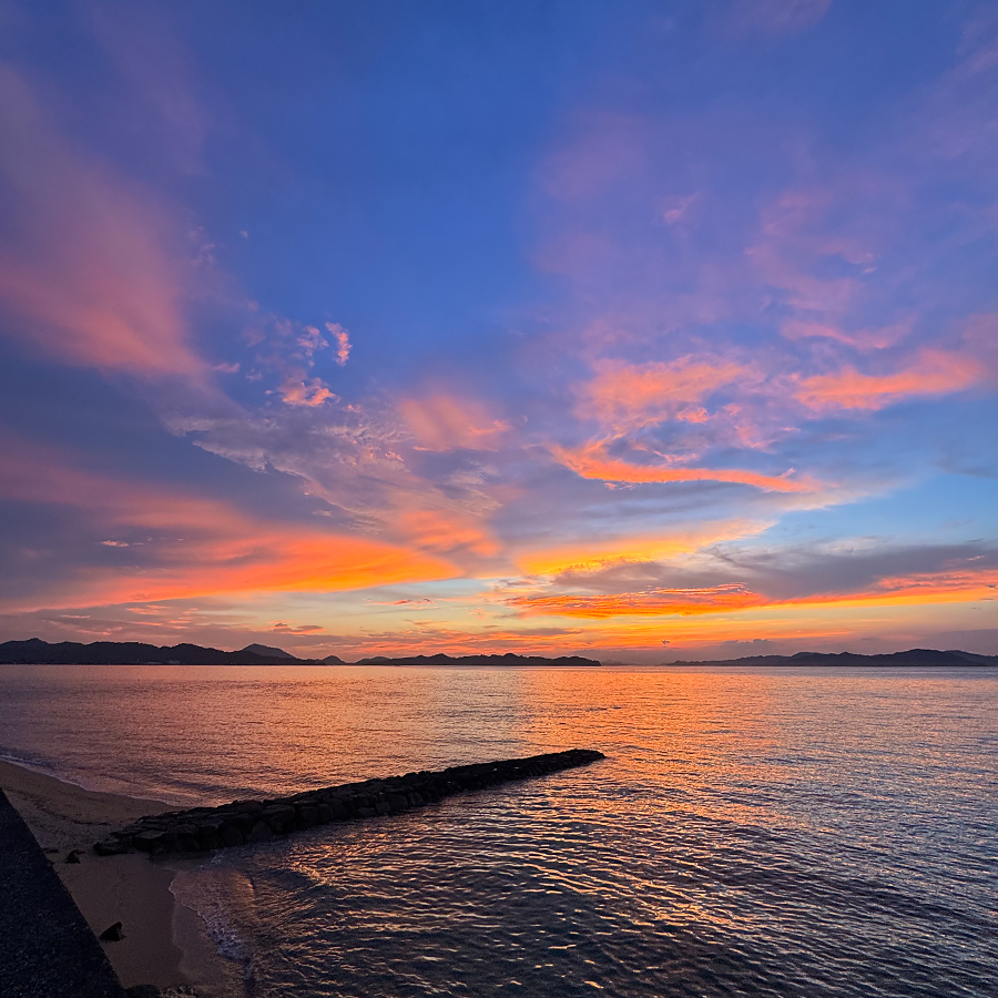 日中は海と空の青さに島の緑が映え、夕日が沈むと茜色の中に島影が浮き上がりロマンチックです。