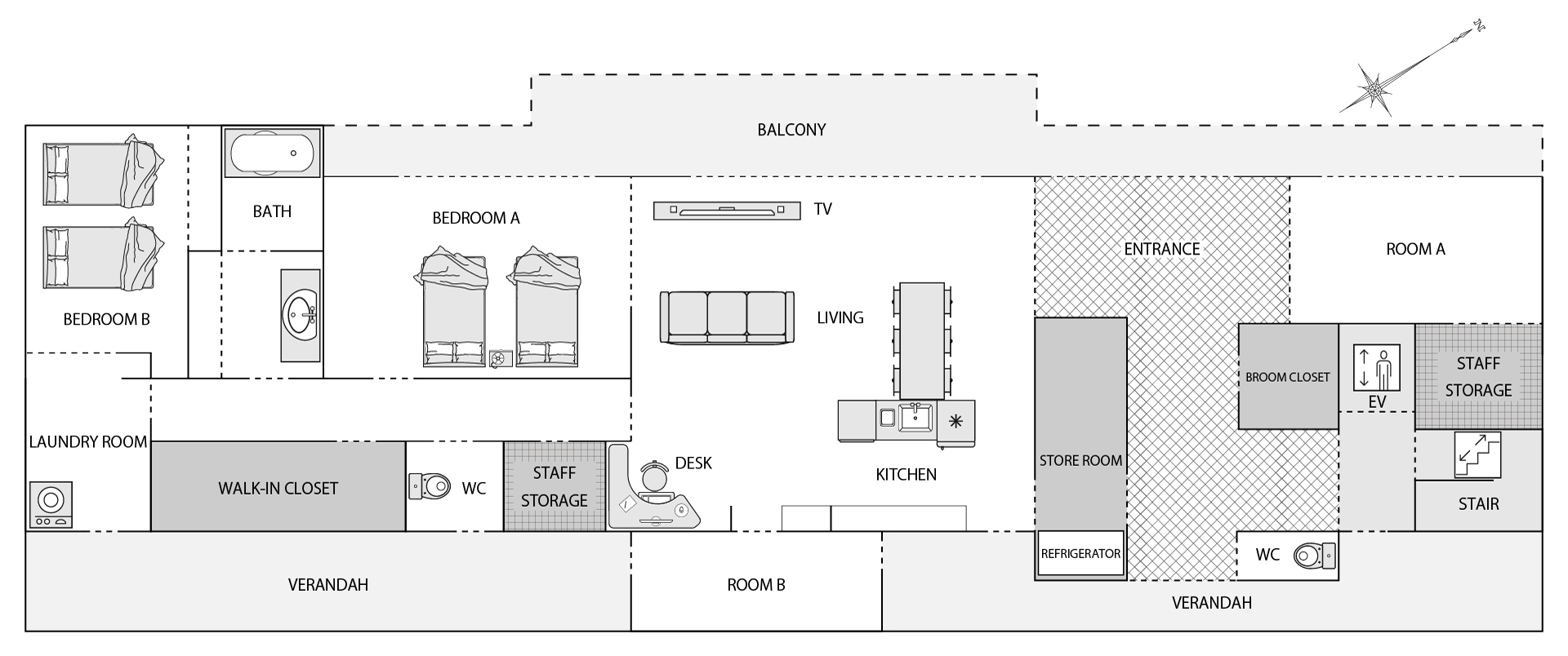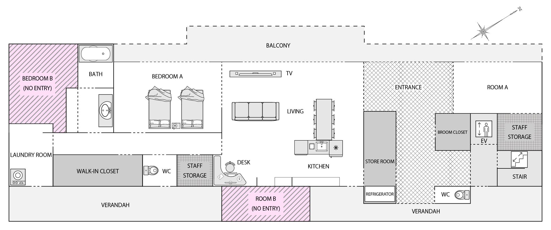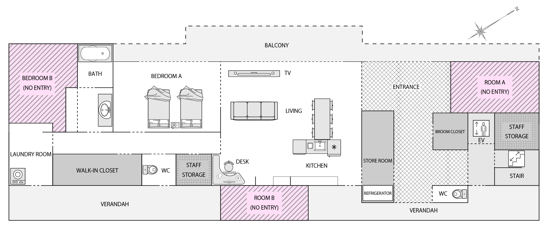 2名での宿泊の場合、ルームA・ルームB・ベッドルームBは締め切って立入禁止となります。